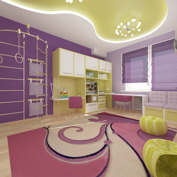 considered that the most appropriate color for girls - pink. But its combination with purple and salad looks much more interesting. The atmosphere is reminiscent of the room is not the fairy-tale forest, not the uncharted planet. Rich colors sisters charged with energy for the whole day, and the smooth curves of the ceiling and a picture of the carpet make the interior even more harmonious. Unusual details, such as the chandelier and ottoman, make the room a touch of fun.